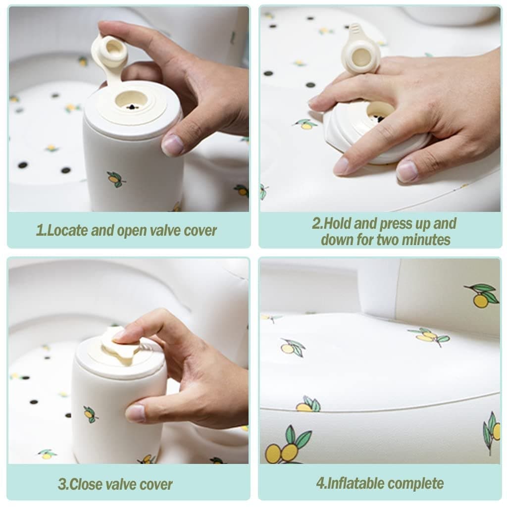 Dickes BPA-freies PVC, aufblasbar durch eine eingebaute unsichtbare Luftpumpe, Luftlöcher im Sitz, um die Luft strömen zu lassen, und eine Fußstütze, die es den Eltern erleichtert, ihr Baby zu halten
